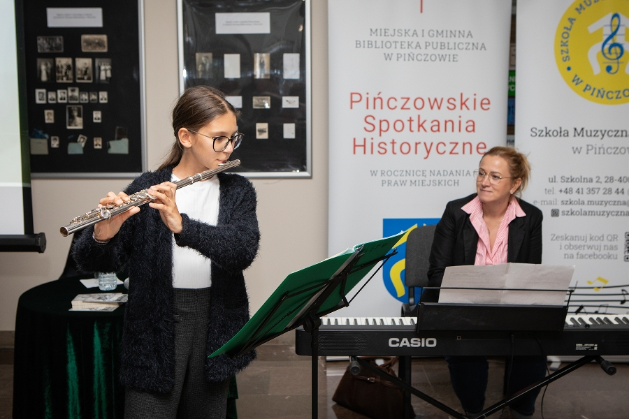 Całość wydarzenia uświetnił występ uczniów Szkoły Muzycznej I stopnia w Pińczowie, którzy zadbali o wyjątkową oprawę artystyczną. Publiczność mogła wysłuchać nastrojowych utworów w wykonaniu młodych muzyków z klas podstawowych, grających na skrzypcach, flecie i akordeonie. Ich występ wprowadził ciepłą, refleksyjną atmosferę i stanowił piękne dopełnienie historycznej narracji.